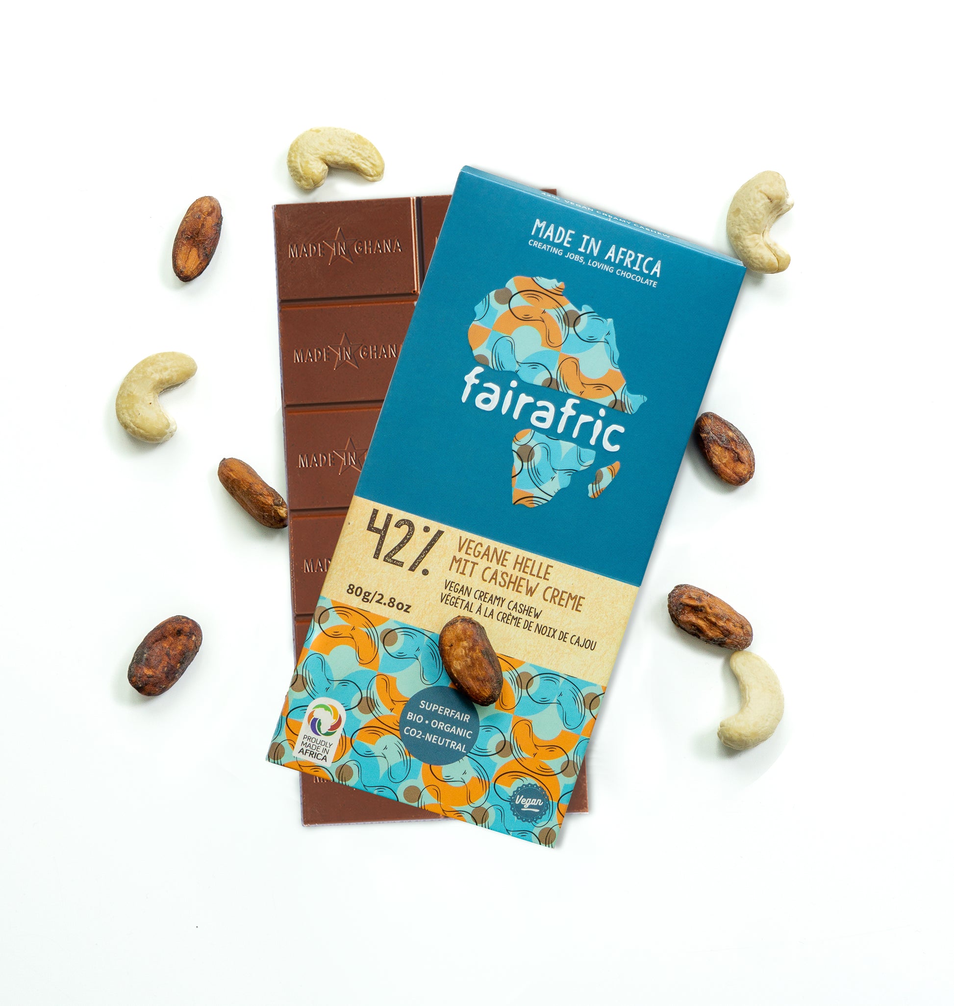 The newest addition to our vegan range. 42% vegan light chocolate with cashew cream!